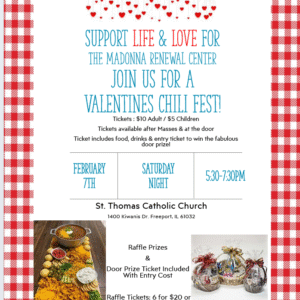 Chili Fest ❤️ Support Life and Love at the Madonna Renewal Center Join ... 07 Feb 5:30 pm - 7:30 pm St. Thomas Catholic Church1400 Kiwanis Drive Freeport, IL 61032